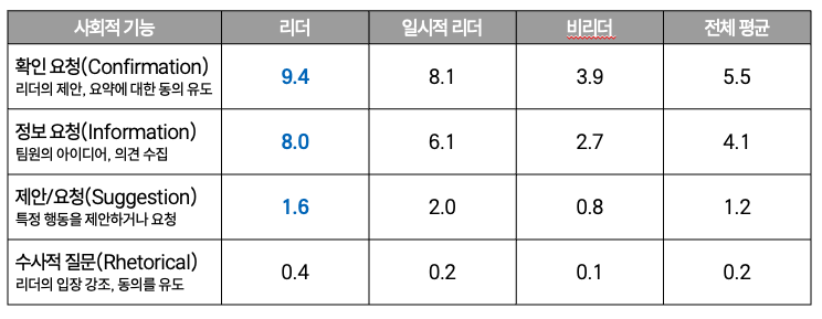 → 리더들은 질문을 통해 논의를 조율하고, 그룹 내에서 자신의 권위를 구축하는 것으로 나타났다.