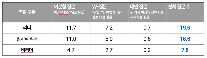 - 리더로 인식된 사람들은 평균적으로 비리더보다 2.5배 이상 많은 질문을 사용하는 것으로 나타났다.