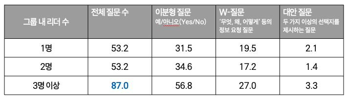 - 리더가 1명과 2명인 그룹은 평균 53.2개의 질문을 사용했으며, 리더가 3명 이상인 그룹은 평균 87개의 질문을 사용했다.