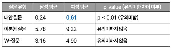 - 여성과 남성의 질문 사용 패턴을 비교한 결과