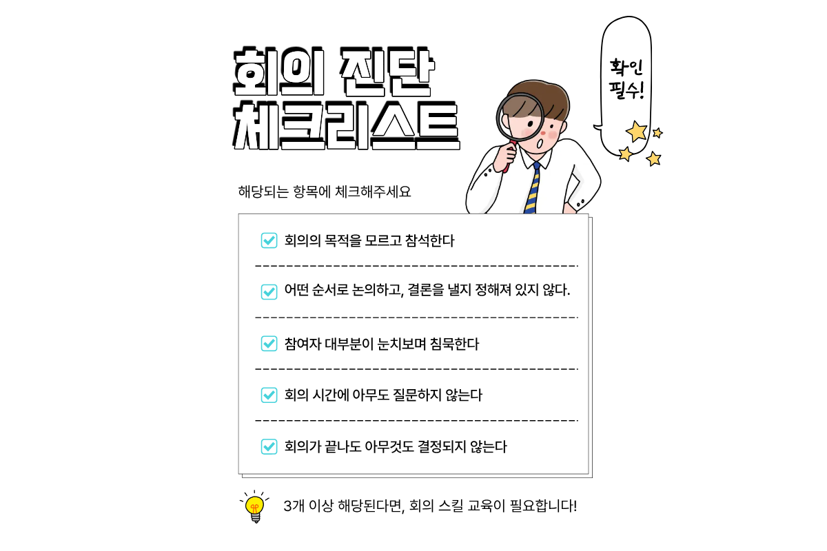퍼실리테이션 회의 스킬 답답한 회의 문화를 바꾸는 첫 걸음!퍼실리테이션은 대화를 설계하고, 구성원의 생각을 실행으로 이끄는 리더십입니다. 💬 회의는 많은데, 왜 결론은 없을까? 같은 회의실에 앉아 있지만, 팀원과 리더는 다른 회의를 경험합니다. 😟 30분 후 회의실로! 회의 참석만 하라고 하고, 아젠다가 없어요. 뭘 준비해야 하는지도 모르겠고… 😟 의견 내면 묻고 따지기 바쁘고,의견을 말하는 것도 눈치 보여요… 🙄 회의 참석자는 10명인데, 발언하는 사람은 딱 2명!나머지는 보고만 듣다가 나와요. 왜 온 건지… 🤔 회의는 시간 했는데, 여전히 문제는 해결이 안 됐어요.결론도 없고, 누가 뭘 하기로 했는지도 모르겠고… ⚠️ 그런데, 리더의 입장에서도 답답하긴 마찬가지입니다 🧑💼 회의가 길어지면 안되니까, 빨리 정리하고 끝내야겠다.내 생각에는… 🤦♀️ 자유롭게 말하라고 하는데도 아무도 말을 안 해요.생각이 없는 건지, 관심이 없는 건지… 👨💼 예전에 다 해봤던 것으로 의견을 내더라고요,새로운 의견은 없는건지… 🙍♂️ 결국 내가 지시하고 결정하는 구조가 되더라고요,팀원 의견도 듣고 싶은데… ✨문제는 누가 잘못했는가의 문제가 아니라대화의 구조에 있습니다.팀원이 침묵하는 이유는, 의지가 없어서가 아니라발언할 수 있는 심리적 안전감과 구조가 없기 때문입니다.리더가 답답한 이유도, 권한이 약해서가 아니라 회의 설계와 진행 방식을 배운 적이 없기 때문입니다. ⁉️ 그렇다면, 우리팀 회의는 어떤가요? 지금 아래 체크리스트로 점검해보세요! ✨회의는 단순한 정보 공유가 아닌, 팀의 사고를 확장시키는 구조적 대화로 설계되어야 합니다.그 회의 프로세스를 설계할 수 있는 리더의 퍼실리테이션 스킬은회의 문화를 바꾸는 핵심입니다. 🎯 회의 리더십, 변화 포인트 5가지 의견을 모으는 회의가 아니라, 집단 지성의 의미를 만드는 대화 구조를 설계합니다. 🧭 방향을 설계하는 리더즉흥적인 회의가 아니라, 명확한 목적과 프로세스에 기반한 대화를 설계합니다.리더는 회의 주제·참여자·결과물을 미리 정의하고모든 구성원이 ‘왜 이 회의에 참여하는가’를 이해하도록 이끕니다. 💡 사고를 확장시키는 리더정답을 주는 리더가 아니라팀원들이 생각을 이끌어내는 질문과 경청의 리더로 변화합니다.리더의 한마디보다 팀의 사고가 커지는 순간이 회의 성과를 높입니다. 👥 참여적 의사결정을 촉진하는 리더리더는 구성원의 사고-논의-합의의 전 과정에 주체적으로 참여하도록 설계합니다.이 과정에서 누구의 의견이 옳은지를 가리는 대신, 서로의 생각이 합의된 기준에 따라 정리되고 결정될 수 있도록 합니다. 합의된 의사 결정은 실행의 지속력과 책임감이 강화됩니다. 🤝 협업의 시너지를 창출하는 리더서로 다른 관점이 충돌하지 않고, 보완과 통합의 에너지로 전환되도록 돕습니다.리더는 심리적 안전감을 기반으로 신뢰의 문화를 만들고,팀 내 관계를 협력의 구조로 설계합니다.이를 통해 회의는 토론이 아니라 공동의 방향을 만들어갑니다. ✨ 실행을 만드는 리더회의의 끝은 행동의 시작입니다.리더는 합의된 내용을 실천 가능한 계획으로 구체화하고,실행을 점검할 수 있는 피드백 구조를 만듭니다. 🧩 회의 스킬 교육 이런 분들에게 추천합니다 👔 팀 리더/ 중간관리자 : 수평적 회의 문화를 만들고 싶은 분🙎♂️ 신임 팀장 : 회의 스킬을 체계적으로 배우고 싶은 분🙎🏻♀️ 프로젝트 리더 : 다양한 이해관계자와 협업이 필요한 분 🔍 회의 리더십, 리더의 퍼실리테이션 회의 스킬 커리큘럼 M1ㅣ그룹을 이끄는 리더십, 퍼실리테이티브 회의 리더십 왜 퍼실리테이티브 리더십인가?나의 회의 리더십 스타일 진단하기퍼실리테이티브 회의 리더십의 핵심 요소 5가지회의 전문가, 퍼실리테이터의 역할 M2ㅣ모두가 말하는 회의, 심리적 안전감 만들기 모든 구성원이 발언하는 환경, 심리적 안전감의 중요성심리적 안전감을 높이는 리더의 지적겸손 실천하기리더가 중립성을 유지하는 방법긍정적인 회의 분위기 조성하기 M3ㅣ팀의 지혜를 모아 결과를 만드는 의사결정 기술 참여적 의사결정을 위한 FOCUS 모델 구조화된 대화 프로세스를 위한 회의 기법 회의 기법을 활용한 주제별 회의 실습 M4ㅣ참여를 유도하는 퍼실리테이터의 핵심 스킬 생각의 확산을 돕는 경청과 질문, 기록의 기술의견 차이를 다루는 건설적 갈등 관리리더의 피드백 기술모니터링을 통한 회의 분위기 관리 M5ㅣ실전, 상황별 회의 설계 및 진행 참여적 의사결정을 위한 회의 설계 원칙상황별 회의 설계와 회의 진행 실습상호 및 전문가 피드백 M6ㅣ퍼실리테이티브 리더로 성장하기 과정 리뷰 개인별 액션 플랜 수립 ※ 위의 교육 구성은 2일 (14시간) 기본 모듈이며, 교육 내용과 시간은 기업의 요청에 따라 맞춤형으로 진행이 가능합니다. 단, 리더의 퍼실리테이션 회의 스킬 교육은 효과적인 학습 목표 달성을 위해 최소 3시간부터 가능합니다. 수행 사례 자세히 보기