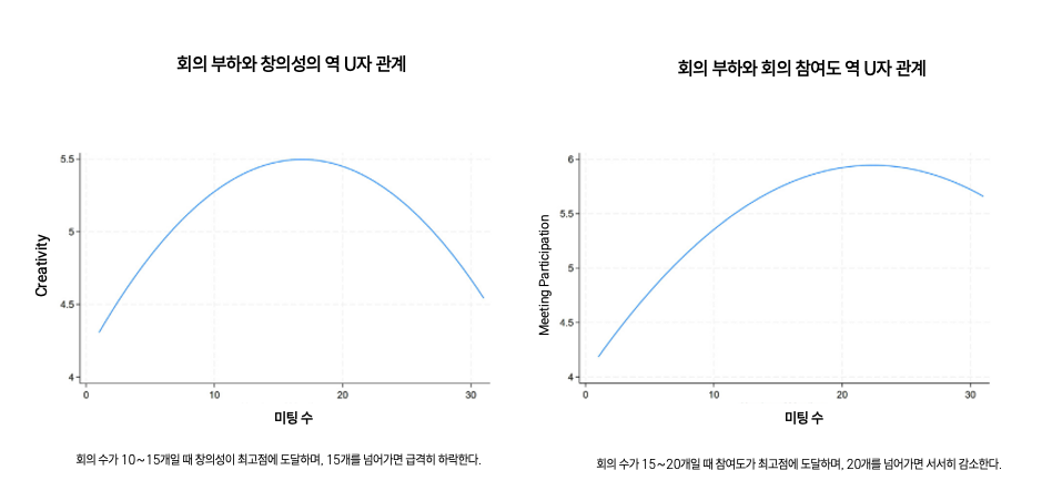연구진은 주당 회의 참석 횟수와 세 가지 핵심 성과 지표(창의적 성과, 회의 참여도, 업무 몰입도)의 관계를 분석했다.