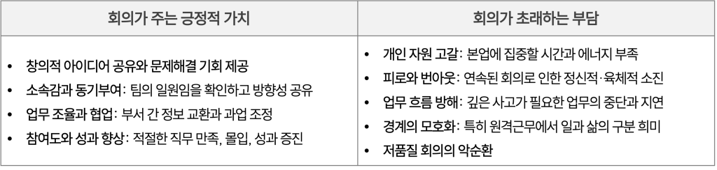 적절한 회의는 긍정적인 효과를 내지만, 과도한 회의는 부담을 초래한다.